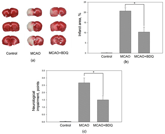 First, we evaluated whether intraperitoneal administration of BDQ has an effect on ischemia-induced brain damage by measuring infarct sizes in brains of rats subjected to MCAO. As can be seen in Figure 1a,b, the infarct size in MCAO group brains was 20.7 ± 1.6% and in the MCAO+BDQ group, it was substantially reduced, to 10.3 ± 2.4%.