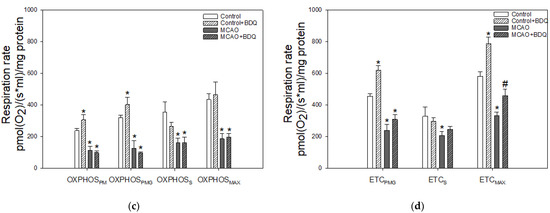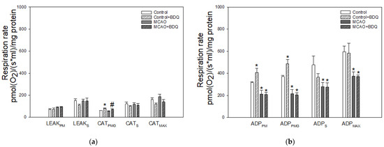 Mitochondrial respiration rates after MCAO and BDQ treatment. (a)—Oxygen consumption rates (OCRs) in the proton leak linked respiration states with complex I (LEAKPM and CATPMG), complex II (LEAKS and CATS), and complex I +II (CATMAX) substrates; (b)—OCRs in the ADP-stimulated respiration states with complex I (ADPPM and ADPPMG), complex II (ADPS), and complex I +II (ADPMAX) substrates; (c)—calculated values of OCRs linked to oxidative phosphorylation (identical metabolic states to Figure 3b; (d)—OCRs linked to maximal electron transport chain (ETC) capacities with complex I (ETCPMG), complex II (ETCS), and complex I +II (ETCMAX) substrates. LEAK refers to a metabolic state in which mitochondria and substrates are added to the reaction chamber without ADP; CAT refers to a metabolic state induced by the addition of 2 μM carboxyatractyloside (CAT); ADP refers to a metabolic state in which mitochondria, substrates, and ADP are present; OXPHOS refers to a calculated value representing OCRs strictly linked to oxidative phosphorylation; ETC refers to the OCRs of uncoupled mitochondria. The substrates are abbreviated: P—pyruvate; M—malate; G—glutamate; S—succinate; MAX—all of the listed substrates. Data are presented as Mean ± SEM of 6–7 experiments on individual animals. Statistically significant difference (p < 0.05): *—compared to control; #—compared to MCAO.