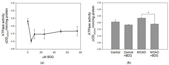 BDQ is known as an inhibitor of ATP synthase in liver mitochondria [43]; however, we did not observe a BDQ inhibitory effect on OXPHOS respiration rates in brain mitochondria. Therefore, we questioned whether BDQ could inhibit a reverse reaction—hydrolysis of ATP by ATPase of isolated brain mitochondria. The direct effect of BDQ on ATPase activity in isolated brain mitochondria is represented in Figure 3a: ATPase was inhibited by about 50% with 5μM BDQ and stayed at a similar level with higher concentrations of BDQ. Pretreatment with 2 mg/kg BDQ before MCAO also resulted in a significant decrease in the activity of ATPase: in ischemic mitochondria pretreated with BDQ, ATPase activity was 19% lower compared to the MCAO group (Figure 3b). A tendency toward decreased ATPase activity was also observed in mitochondria isolated from brains of BDQ-treated healthy rats compared to control, although the effect was not statistically significant (Figure 3b). It is worth mentioning that the calculated theoretical plasma concentration of BDQ would be about 50 µM after injection of 2 mg/kg dose (assuming 100% bioavailability) and, as BDQ has been reported to be able to accumulate in CNS in rodents [44], estimated BDQ concentration in the CNS after such dose would be within the 5–75 µM range. This is consistent with the BDQ concentration range directly causing ATPase inhibition in isolated mitochondria (Figure 3a).