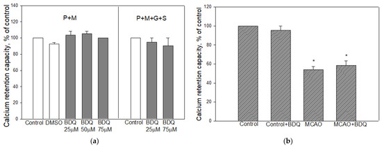 Effect of BDQ on mitochondrial calcium retention capacity. (a)—the direct effect of BDQ and vehicle dimethyl sulfoxide (DMSO) on isolated brain mitochondrial calcium retention capacity using pyruvate and malate or pyruvate, malate, glutamate, and succinate as substrates; (b)—mitochondrial calcium retention capacity after MCAO with/without BDQ using pyruvate and malate as substrates. Data are presented as Mean ± SEM of 3–6 experiments on individual animals. *—Statistically significant difference compared to control (p < 0.05).
