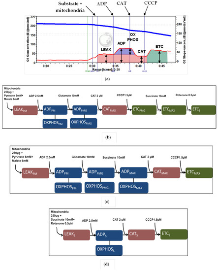 Substrate, uncoupler, and inhibitor titration protocols. (a)—Representation of different metabolic states investigated in our experiments. Image is taken from Oroboros DatLab software interface, where the blue line represents oxygen concentration in the chamber and the red line represents the OCRs at a given moment. (b)—Substrate, uncoupler, and inhibitor titration protocol 1. (c)—Substrate, uncoupler, and inhibitor titration protocol 2. (d)—Substrate, uncoupler, and inhibitor titration protocol 3.