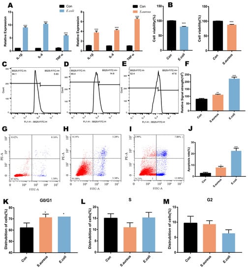 Compared with those in the control group, the intracellular reactive oxygen levels in the E. coli- and S. aureus-stimulated groups were significantly increased (Figure 1C–F). Compared with the control group (Figure 1G), the E. coli-stimulation group (Figure 1I) and the S. aureus group (Figure 1H) showed significantly increased rates of apoptosis of the cells. E. coli and S. aureus promoted cell-cycle arrest in the G0/G1 phase (Figure 1K–M) and reduced the proportions of cells in the G2 and S phases to varying degrees, thereby inhibiting cell proliferation.