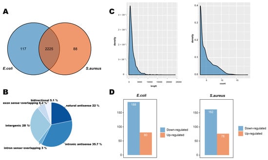 (A) Venn diagram showing the numbers of lncRNAs found in the E. coli and S. aureus groups. (B) Novel lncRNAs, mainly classified as intergenic lncRNAs, natural antisense lncRNAs and intronic antisense lncRNAs. (C) Distribution of transcript lengths and counts in the lncRNAs. The X-axis depicts the lncRNA length and count, and the Y-axis represents abundance. (D) Histogram of the differentially expressed lncRNAs in the E. coli and S. aureus groups. Columns indicate significantly upregulated lncRNAs (red) and downregulated lncRNAs (blue) (p < 0.05).