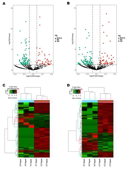 Volcano plots of lncRNAs differentially expressed between the control group, the E. coli group (A) and the S. aureus group (B). The red dots on the right indicate the significantly upregulated lncRNAs, and the green dots on the left indicate the significantly downregulated genes (p < 0.05). The black dots represent no significant difference (p > 0.05). Heatmap of lncRNAs differentially expressed between the control group, the E. coli group (C) and the S. aureus group (D). Green-to-red scale indicates low-to-high lncRNA expression levels. Differentially expressed lncRNAs were defined based on a threshold fold change >1.5 at p < 0.05.