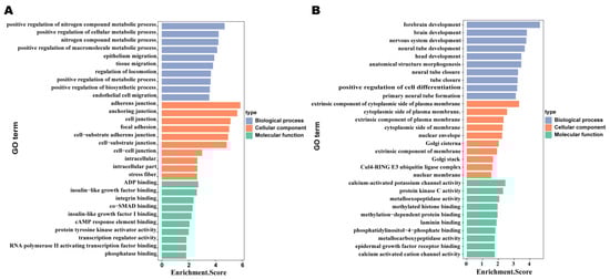 The top 10 GO terms enriched for the targets of significantly downregulated expressed lncRNAs in three categories (biological process, cellular component and molecular function). (A) S. aureus; (B) E. coli. p ≤ 0.05 = significant enrichment.