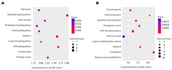 The top 10 KEGG pathways enriched for the targets of significantly downregulated expressed lncRNAs. (A) E. coli; (B) S. aureus. p ≤ 0.05 = significant enrichment.
