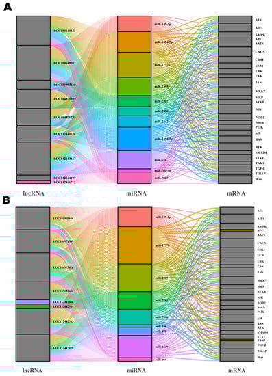 We selected the differential expression analyses of the lncRNAs. Analyses of gene ontology (GO) enrichment for the lncRNA target genes were completed using the DAVID software, and p < 0.05 was considered significant. We used the DAVID [] software to test the statistical enrichment of differentially expressed lncRNA target genes in the Kyoto Encyclopedia of Genes and Genomes (KEGG; https://www.kegg.jp/kegg/, accessed on 27 April 2020). Additionally, we used RNAhybrid (2.1.2) to predict lncRNA and miRNA interactions []. The downstream mRNAs were predicted using Targetscan (http://www.targetscan.org/vert_72/, accesed on 20 April 2021) for predicted miRNAs.