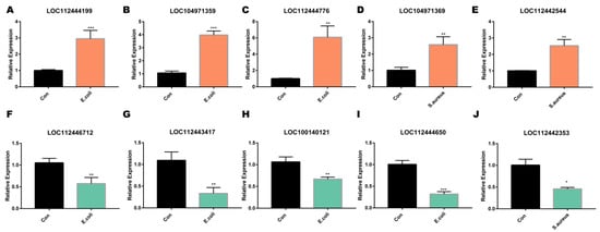 Validation of the differentially expressed lncRNAs by RT-qPCR. (A–E) the upregulated expressed lncRNAs, (F–J) the downregulated expressed lncRNAs. Values are means ± SD, n = 3. *, ** and *** represent p < 0.05, p < 0.01 and p < 0.001, respectively.