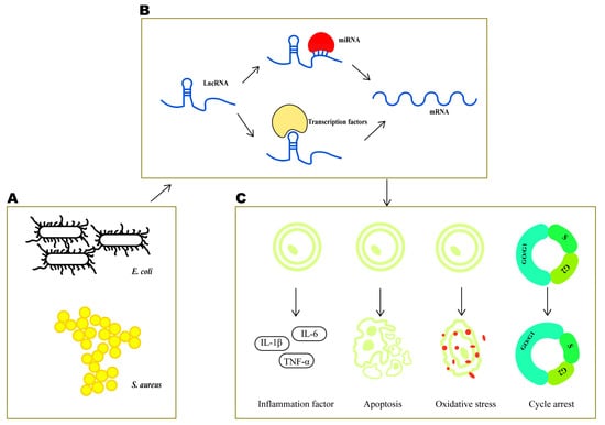 Schematic of relationship between lncRNAs and cell injuries induced by E. coli and S. aureus. (A) Cell injuries inducer of S. aureus and E. coli, (B) LncRNA interact with mRNA in both cis and sponge manners during cell injuries, (C) Cell injuries regulated by LncRNA.