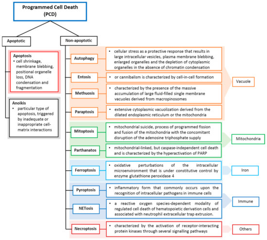 Cell death may occur when the damage is severe, and the repair response is unable to provide protection or recovery, or it can be due to self-orchestration. Like other cell deaths, tumour cell death can occur programmed and accidentally, depending on the signalling pathway. Programmed cell death (PCD) closely depends on tightly regulated intracellular signal transduction pathways [3,4], whereas accidental cell death is referred to as non-PCD due to unexpected cell injury. PCD can be further divided into apoptotic cell death and non-apoptotic cell death based on morphological characteristics and molecular mechanisms (Figure 1). Apoptosis preserves cell membrane integrity and happens in a caspase-dependent manner. On the other hand, non-apoptosis cell death occurs by membrane rupture and it is caspase-independent.