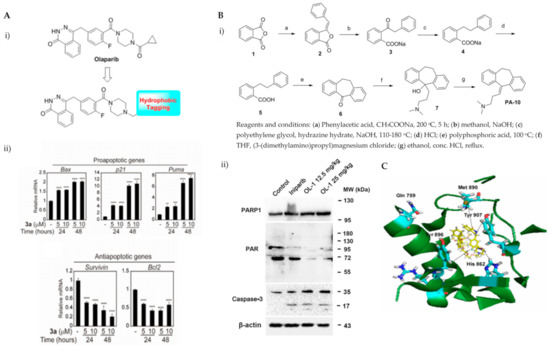 (A). (i) The strategy used to develop small molecule 3a, a PARP hydrophobic tagged-molecule. (ii) The expression of proapoptotic and antiapoptotic target genes measured using quantitative RT-PCR in TNBC cells treated with either vehicle or small molecule 3a at indicated times. **** p < 0.001. (B). (i) The general synthesis of compound PA-10 (3-(10,11-dihydro-5H-dibenzo[a,d] [7]annulen-5-ylidene)-N,N-dimethylpropan-1-amine), the lead compound used to synthesize OL-1. (ii) Western blot analysis of PARP, PAR and caspase-3 in tumour tissues excised from the MDA-MB-436 xenograft treated with PBS, Iniparib (100 mg/kg/d), low dose (12.5 mg/kg/d) and high dose (25 mg/kg/d) of OL-1. (C). Binding of conjugate 3 in the C-terminal catalytic domain of PARP1, obtained from molecular docking studies. Best pose of conjugate 3 (yellow sticks) forming hydrogen bond interactions (dotted lines) with key amino acid residues (cyan sticks) in NI, PH, and AD sites. PARP1 is shown as green ribbon. Figure 3A was reprinted with permission from Ref. [26]. Copyright (2020) European Journal of Medicinal Chemistry. Figure 3B was reprinted with permission from Ref. [27]. Copyright (2016) Springer Nature. Figure 3C was reprinted with permission from Ref. [28]. Copyright (2019) ACS publications.