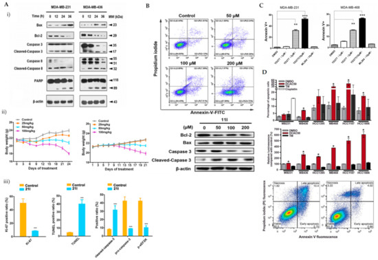 (A) (i) Western blot analysis of apoptosis-related proteins in MDA-MB-231 and MDA-MB-436 cells treated with 21l; (ii) tumour volumes changes observed in MDA-MB-231 or MDA-MB-436 cell xenograft mice treated with various doses of 21l; (iii) quantitative changes of pro- and cleaved-caspase-3 and p-eEF2K observed in the immunohistochemistry of tumour tissues excised from the control- and median-dose group treated MDA-MB-231 xenograft mice. *** p < 0.001 (B) Apoptotic cells detected using Annexin V/PI co-staining and western blot analysis of apoptotic-related proteins in MDA-MB-231 cells were treated with DMSO and compound 11l for 24 h. (C) Apoptotic cells detected using Annexin V/PI co-staining in MDA-MB-231 and MDA-MB-468 cells treated with various doses of YD277. DMSO serves as negative control whilst ML-264 is the parent compound. ** p < 0.01, *** p < 0.001 (D) Percentage of apoptotic cells detected using Annexin V/PI co-staining in TNBC cells treated with 20 mmol/L DCAC50, 30 mmol/L tetrathiomolybdate (copper chelator) or 20 mmol/L cisplatin (positive control) for 72 h. * p < 0.05 versus DMSO control, according to the two-tailed Student t test. Figure 4A was reprinted with permission from Ref. [38]. Copyright (2018) European Journal of Medicinal Chemistry. Figure 4B was reprinted with permission from Ref. [39]. Copyright (2020) European Journal of Medicinal Chemistry. Figure 4C was reprinted with permission from Ref. [40]. Copyright (2019) Molecular Cancer Therapeutic.