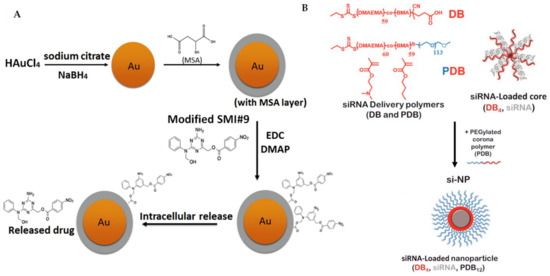 (A) Synthesis of SMI#9-gold nanoparticle was performed, starting from the reduction of chloroauric acid with sodium borohydride, followed by capping using mercaptosuccinic acid (MSA) and finally ester coupling of the modified SMI#9 using 1-ethyl-3-(3-dimethylaminopropyl)carbodiimide (EDC)/4-dimethylaminopyridine (DMAP). This nanoparticle undergoes endocytosis and releases the drug SMI#9 in the cell. (B) Three-component nanoparticles for delivery of siRNA, using core-forming polymer (poly(DMAEMA-co-BMA), DB4) and PEGylated and corona-forming polymer (PEG-b-poly(DMAEMA-co-BMA), PDB12). Figure 7A was reprinted with permission from Ref. [155]. Copyright (2016) Nanomedicine: Nanotechnology, Biology, and Medicine. Figure 7B was reprinted with permission from Ref. [156]. Copyright (2018) Cancer Research.