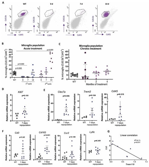 Microglial depletion is followed by a rapid repopulation, mediated by microglial activation, in 2-month-old Cx3cr1CreER/Csf1rflx/flx mice. (A). Representative flow cytometry images for the analysis of microglial cells (Cd45+Cd11b+) in WT and Cx3cr1CreER/Csf1rflx/flx mice subjected to acute tamoxifen treatment (7 days) and sacrificed 0, 7, or 14 days after the end of the treatment. (B). Quantification of microglial population after tamoxifen acute treatment, by flow cytometry, in cortical regions. The 1st cycle: 7 days tamoxifen; 2nd cycle: 7 days of tamoxifen administration after 14 days of the end of the first cycle. Mice were sacrificed 0, 7, or 14 days after the end of the corresponding cycle. (C). Microglial population, quantified by flow cytometry, in WT and Cx3cr1CreER/Csf1rflx/flx mice subjected to oral tamoxifen administration for 1, 2 or 4 months. Animals were sacrificed at the end of the treatment. (D–F). Quantification, by qPCR, of mRNA expression of the proliferation marker Ki67, normalized by Gapdh (D); microglial activation markers Clec7a, Trem2, Cd45, normalized by Tmem119 (E); and immune infiltration markers Cd3, Cd163, Ccr2 and Ly6c, normalized by Gapdh (F); in the hippocampus of WT and Cx3cr1CreER/Csf1rflx/flx mice subjected to acute tamoxifen treatment and sacrificed 7 days after. (G). Correlation between Tmem119 (microglial homeostatic marker) and Cd3 (lymphocytic marker) mRNA expression, quantified by qPCR and normalized by Gapdh, in the hippocampus of Cx3cr1CreER/Csf1rflx/flx mice subjected to acute tamoxifen treatment and sacrificed 7 days after the end of the treatment. See Supplementary Table S1 for Antibodies, Probes and Methods used. Statistical significance was analyzed using the t-test or the ANOVA test, followed by the Fisher LSD test.