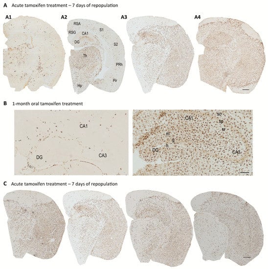 Microglial repopulation in Cx3cr1CreER/Csf1rflx/flx mice. (A,B). Microglial immunostaining (Iba1+ cells) in brain sections of Cx3cr1CreER/Csf1rflx/flx mice subjected (A) to acute tamoxifen administration (7 days) and sacrificed 7 days after the end of the treatment (n = 4 animals); (B) oral tamoxifen treatment for 1-month (n = 2 animals). (C). Consecutive brain sections immunostained with Iba1+ from a Cx3cr1CreER/Csf1rflx/flx mouse subjected to 7-days tamoxifen treatment and sacrificed 7 days after the end of the treatment. See Supplementary Table S1 for Antibody and Method used. RSA, retrosplenial agranular cortex; RSG, retrosplenial granular cortex; PRh, perirhinal cortex; Pir, piriform cortex; S1 primary somatosensory cortex; S2 secondary somatosensory cortex; Th, thalamus; Hp, hypothalamus; CA1, field CA1 of hippocampus; CA3, field CA3 of hippocampus; DG, dentate gyrus; so, stratum oriens; sp, stratum pyramidale; sr, stratum radiatum; m, molecular layer; g, granular layer; h, hilus. Scale bars: (A,C) 50 mm; B 200 μm.