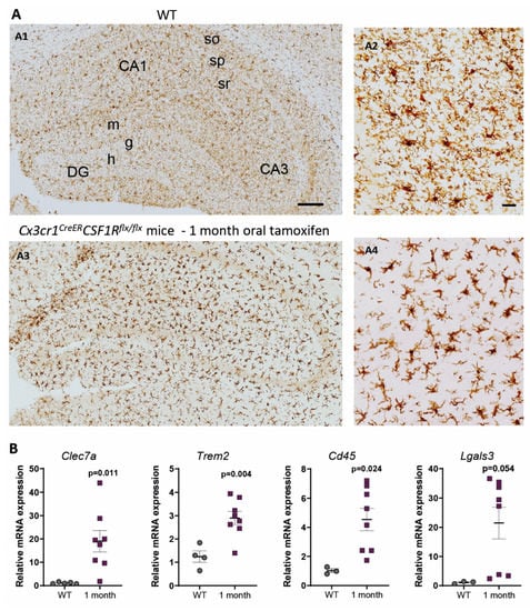 Microglial activation after 1-month oral tamoxifen administration in Cx3cr1CreER/Csf1rflx/flx mice. (A). Iba1 immunostaining in WT and Cx3cr1CreER/Csf1rflx/flx mice subjected to 1-month of tamoxifen treatment. CA1, field CA1 of hippocampus; CA3, field CA3 of hippocampus; DG, dentate gyrus; so, stratum oriens; sp, stratum pyramidale; sr, stratum radiatum; m, molecular layer; g, granular layer; h, hilus. Scale bars: A1, A3 200 μm; A2, A4 10 μm. (B). mRNA expression of microglial activation markers (Clec7a, Trem2, Cd45 and Lgals3), quantified by qPCR and normalized by Tmem119 (microglial homeostatic marker), in the hippocampus of WT and Cx3cr1CreER/Csf1rflx/flx mice treated with tamoxifen for 1 month. See Supplementary Table S1 for Antibody, Probes and Methods used. Statistical significance was analyzed using the t-test.