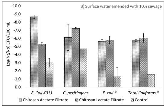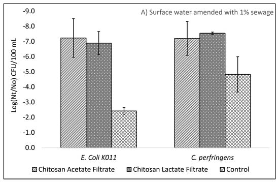 Survival fraction (Nt/N0) and Log10 reductions (Log10(Nt/N0)) were calculated from duplicate plate counts per sample dilution for influent and effluent test waters. Error in reported data, tables, and graphs is expressed as standard deviation. Differences between filtered effluent and filtered effluent pretreated with chitosan were evaluated using nonparametric Mann–Whitney U and Kruskal–Wallis ANOVA with post hoc Dunn’s statistical tests performed in Graphpad Instat 3 and interpreted using a significance level of α = 0.05.