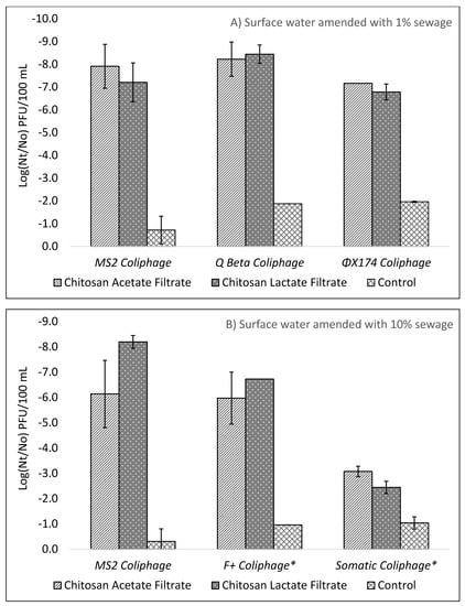 10 for chitosan pretreatment and filtration but were lower than the log reductions achieved by lab strain