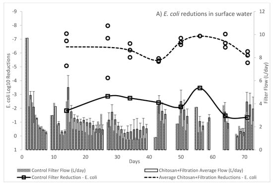 In contrast to the WHO, the US Environmental Protection Agency (EPA) POU requirement specifies treated water quality targets of a 6 Log10 reduction for bacteria, 4 Log10 reduction for virus and 3 Log10 reduction for protozoa in the EPA 1987 Guide Standard and Protocol for Testing Microbiological Water Purifiers. The long-term evaluation exceeded the EPA 1987 Guide Standard minimum reductions with average 6.39 log10 reduction for E. coli KO11 and the afore mentioned viral reduction. Given that protozoa are larger than bacteria, it is assumed that devices operating on removal by size exclusion will meet or exceed the bacteria reductions for protozoa. Treatment with combined chitosan and filtration exceeded the 3 Log10 reduction target for C. perfirngens, a common surrogate for protozoa.