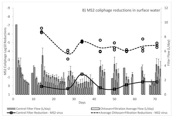 20]. Unlike filters utilized in the optimization experiments, filters utilized in our long-term experiments were pre-conditioned for 14 days prior to filtered effluent microbial sampling. Adsorption sites on long-term filters would therefore likely have had increased loading from microbes and suspended solids present in surface water as compared to filters without break in.