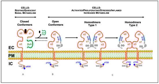 Model illustrating the described conformational states and cis-associations of cell surface MHC-I molecules. (A) Classical MHC-I molecules are trimeric composites of a transmembrane heavy chain (αHC) organized into three domains (α1, α2, and α3), non-covalently associated with a light chain (β2m) and a small peptide (A). These trimeric structures are differentially expressed at the plasma membrane of nucleated cells, and are also designated as closed conformers [5]. The cytoplasmic domain of the αHC of closed conformers contains two conserved motifs: (1) a tyrosine residue at position 320 in all HLA-A and HLA-B alleles that appears to be de-phosphorylated in resting cells (Tyr320, grey circles); (2) a serine residue at position 335 in all HLA-I alleles that appears to be phosphorylated in vivo (pSer335, blue circles). (B) Upon physiological settings associated with an increased metabolic activity (e.g., activation, proliferation, differentiation, etc.), a fraction of the closed conformers dissociate from the β2m and the peptide and generate free αHC, also known as open conformers. As a result, a physiological equilibrium exists where the closed/open conformers ratio decreases or increases depending on the metabolic state of the cell. Contrary to closed conformers, the cytoplasmic domain of the open conformers is serine de-phosphorylated (Ser335, grey circles) and tyrosine phosphorylated (pTyr320, blue circles). The phosphorylation status may allow membrane movement, localization and trafficking [5]. Thus, based on the current knowledge, pSer335 and pTyr320 may be considered as surrogate biomarkers of closed and open conformers, respectively (see [8,9,10,11,12,13,14,15], and text). (C) The open conformers formed at the plasma membrane of metabolically active cells may self cis-associate originating αHC homodimers, or hetero cis-associate originating αHC heterodimers (not shown, see Section 4). While some of these homodimers are non-covalently associated (see text), others are the result of the formation of disulfide bonds between unpaired cysteines located along the sequence of the αHC (see text). Depending on the orientation of the cis-association, two different homodimers may eventually form, type 1 and type 2. In this model, type 1 homodimers will preferentially be involved in trans-interactions with KIR and LILR receptors [5]. In contrast, type 2 homodimers, due to the flexibility of the α1 domain, namely the polymorphic and ordered α-helix (α-H, in blue), will favor cis-associations with nearby immune and non-immune receptors, such as CD8αβ and the insulin receptor (see text). DD, disordered domain (in grey); EC, extracellular milieu; PM, plasma membrane; IC, intracellular milieu.