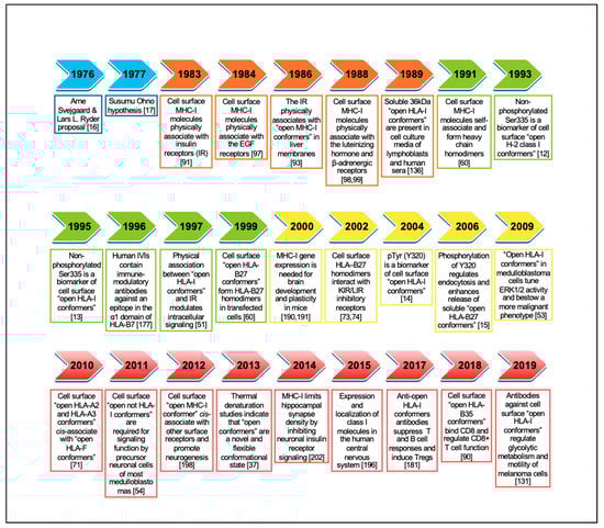 Despite their prominent role in peptide presentation to CD8+ T cells, studies carried out during the 1960s–1970s noticed that MHC-I genes and molecules were associated with non-immunological functions. Thus, in the mid-1970s and 1980s, and as a result of experimental and clinical observations, farsighted scientists put forward four daring hypotheses. In 1976, Arne Svejgaard and Lars Ryder proposed that HLA class I molecules may interfere with ligand–receptor interactions not involved in immune reactions, explaining the reported associations between HLA-I alleles and metabolic and neurobehaviour disorders [16]. In 1977, Susumu Ohno suggested that the original role of cell surface MHC-I molecules was to serve as general anchorage sites of regulatory plasma membrane proteins involved in organogenesis and cell differentiation [17]. In 1985, Morten Simonsen and Lennart Olsson postulated that cell surface MHC-I molecules are a structural part of many receptors that they called compound receptors, with different biological functions [18]. In 1986, Michael Edidin summarized all these findings, including his own work with hormone receptors, and proposed that MHC-I molecules are likely part of functional hormone receptors and that their interactions modify the affinity of the receptors for their ligand [19]. Forty-five years later, these hypotheses have been confirmed to a greater or lesser extent, unveiling an uncharted territory hidden for a long time behind the looking glass. This review critically analyzes past and recent advances that shed light on the non-immunological functions of cell surface MHC-I molecules and their implications in biomedicine. Figure 2 presents a timeline of the most representative achievements that contributed to the body of knowledge on the biology of open MHC-I conformers.