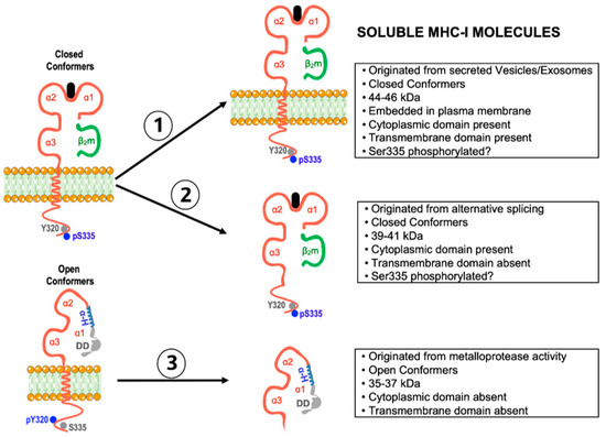 Soluble HLA-A2 and HLA-B7 molecules (in the following, sHLA) in sera of healthy individuals have been known about since the early 1970s [135,136]. Following this, studies showed that sHLA-I molecules were biochemically complex and contained different molecular forms [137,138,139,140]. At present, sHLA-I molecules comprise three main pools that differ in molecular mass and domain composition ([141], Figure 3). The first pool contains sHLA-I conformers of about 44–46 kDa with transmembrane and cytoplasmic domains, and β2m, representing plasma membrane-embedded closed HLA-I conformers, is most likely present in small extracellular vesicles and exosomes [59,137]. The second pool contains sHLA-I conformers of about 39–41 kDa, lacking the transmembrane domain, resulting from the removal of exon four by alternative splicing [138,139]. The third pool contains smaller αHCs with a 35–37 kDa molecular mass, not associated with β2m, and lacking transmembrane and cytoplasmic domains [140]. In human cells, these smaller sHLA-I conformers are derived from cell surface open conformers after proteolytic cleavage by a Zn-dependent membrane metalloprotease [142]. This pathway also releases soluble open conformers of non-classical HLA-E, HLA-G, and CD1d molecules [143].