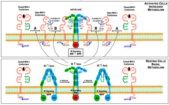 Model for the regulation of insulin signaling by cis-association between cell surface MHC-I molecules and insulin receptors (IR) in insulin-dependent tissues. In resting cells (lower figure), the large majority of MHC-I molecules expressed at the cell surface are closed conformers. Likewise, under resting conditions and low circulating insulin levels, the IR is in its inactive ∩ conformation (signaling off), with the α-C-terminal domains (α-CT) of the IRα chains hidden [120,121]. An increase in the metabolic activity of the cells and the presence of insulin in the external milieu will result in binding of insulin to the IR, inducing a shift towards the active T conformation (signaling on) and the exposure of the α-CT domains [116,117,118,119,120,121]. Under these conditions, the T conformation of the IR with the bound insulin may follow two paths (upper figure). A, to induce the dissociation of β2m and the peptide from nearby closed MHC-I conformers, generating open conformers. B, to directly associate with pre-existing open conformers. In either case, the cis-association may occur between the α-CT domains of the α extracellular chains of the IR and the α-helix (α-H) of the α1 domains, leading to the formation of a complex constituted by one IR:I complex and two αHCs (αHC-IR:I-αHC). Alternatively, the α-helix (α-H) of the MHC-I α1 domains may also interact with N-terminal sequences of the transmembrane β chains of the IR (not shown). Phosphorylated amino acid residues in the cytoplasmic domain of MHC-I molecules are indicated, as in Figure 1. Whether the Tyrosine Kinase Domains (TKD) of the β chains of the IR are involved in the phosphorylation of Tyr320 is not known, but is a likely possibility.