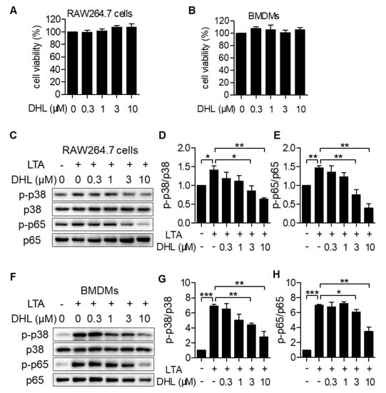 2.1. DHL Attenuates LTA-Induced Phosphorylation of p38 MAPK and NF-κB in RAW264.7 Cells and BMDMs