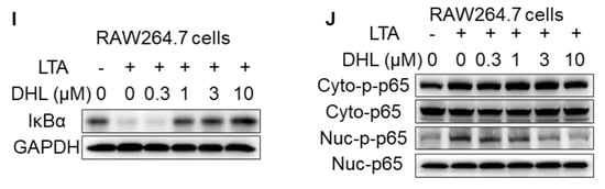 To elucidate the effects of DHL on the activation of p38 MAPK and NF-κB induced by LTA in macrophages, RAW264.7 cells (Figure 1A,C–E,I) and primary BMDMs (Figure 1F–H) were used in this study. We first found that DHL did not cause cytotoxicity at concentrations up to 10 μM with 24 h incubation in RAW264.7 cells and BMDMs (Figure 1A,B). Then, cells were treated with DHL (0, 0.3, 1, 3, and 10 μM) for 0.5 h, followed by exposure to LTA for another 0.5 h. Cell lysates were collected, and the phosphorylation of p38 MAPK and NF-κB was detected by Western blot analysis. As displayed in Figure 1C–H, LTA-induced phosphorylation of p38 MAPK and NF-κB was inhibited by DHL in a dose-dependent manner both in RAW264.7 cells and BMDMs. These results demonstrated that DHL inhibits the activation of p38 MAPK and NF-κB in macrophages. Moreover, to identify the effect of DHL on the NF-κB pathway, the degradation of IκBα was detected, and the effect of DHL on the modulation of p-p65 nuclear translocation in LTA-induced inflammation in RAW264.7 cells was also analyzed. The results revealed that DHL inhibits IκBα degradation (Figure 1I) and phosphorylation and nuclear translocation of NF-κB/ p65 (Figure 1J).