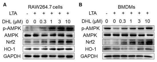 2.2. DHL Promotes the Activation of AMPK/Nrf2 Pathway in LTA-Induced Macrophages