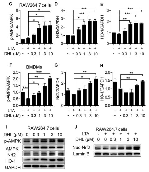 The AMPK/Nrf2 pathway is involved in DHL–mediated macrophage activation by LTA stimuli. RAW264.7 cells (A,C–E) and BMDMs (B,F–H) were preincubated with the indicated concentration (0, 0.3, 1, 3, and 10 μM) of DHL for 0.5 h, followed by LTA (20 μg/mL) stimulation for 0.5 h. (A,E) Cell lysates were prepared for Western blot analysis and the expression of p-AMPK, AMPK, Nrf2, and HO-1 were detected, with GAPDH used as the loading control. The ratios of p-AMPK/AMPK (C,F), Nrf2/GAPDH (D,G) and HO-1/GAPDH (E,H) were analyzed by ImageJ software. (I) RAW264.7 cells were treated with different concentrations (0, 0.3, 1, 3, and 10 μM) of DHL for 0.5 h. Then, cell lysates were prepared to detect the expression of p-AMPK, AMPK, Nrf2, and HO-1, with GAPDH used as the control. (J) RAW264.7 cells were pretreated with DHL (0, 0.3, 1, 3, and 10 μM) for 0.5 h, followed by LTA stimulation for another 0.5 h. Nuclear fractions were extracted and subjected to immunoblot analysis using Nrf2 and Lamin B antibodies. Data are represented as mean ± SEM, n = 3, * p < 0.05, ** p < 0.01, *** p < 0.001.