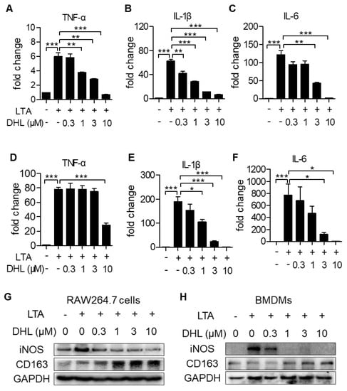Bone-marrow-derived macrophages (BMDMs) were isolated from C57BL/6 mice, and mice femurs and tibias were flushed with PBS and cultured in high-glucose DMEM medium (Gibco-BRL, Grand Island, NY, USA) supplemented with 10% fetal bovine serum (Gibco-BRL, Grand Island, NY, USA), 1% penicillin–streptomycin (Gibco-BRL, Grand Island, NY, USA) and macrophage colony-stimulating factor (M-CSF, 10 ng/mL) (PeproTech, Rocky Hill, NJ, USA) for 6 days in an incubator (37 °C, 5% CO2) as we previously described []. Then, cells were harvested and pretreated with DHL for 0.5 h before stimulation with LTA (20 μg/mL) [] for the indicated time. Murine macrophage cell line RAW264.7 cells (ATCC, Manassas, VA, USA) were cultured in RPMI-1640 media containing 10% FBS (Gibco-BRL, Grand Island, NY, USA) and 1% penicillin–streptomycin (Gibco-BRL, Grand Island, NY, USA). Cells were incubated in an incubator (37 °C, 5% CO2) and treated with indicated concentrations of DHL according to experiment requirements; 0.1% DMSO was added to the culture media as the solvent control. Cells were collected for mRNA and protein analysis.