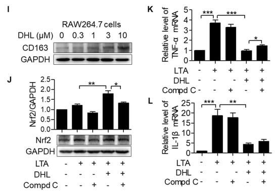 To explore the effect of DHL on macrophage polarization, the expression of M1 phenotype marker genes (proinflammatory cytokine genes TNF-α, IL-1β, and IL-6) were evaluated. As shown in Figure 3A–F, the mRNA levels of these M1-like inflammatory cytokines triggered by LTA were significantly restrained after treatment with DHL in both RAW264.7 cells (Figure 3A–C) and BMDMs (Figure 3D–F). Moreover, we found that DHL inhibited the protein expression of iNOS (M1 marker gene), but promoted CD163 (M2 marker gene) expression (Figure 3G–I). In addition, we observed that Compd C, an inhibitor of AMPK, could restrain the augmentation of Nrf2 induced by DHL (Figure 3J), and partly reverse the effect of DHL on inhibition of TNF-α and IL-1β (Figure 3K–L). Taken together, these results verified that DHL can modulate the M1/M2 macrophage phenotype, which may partly occur through Nrf2 signaling.