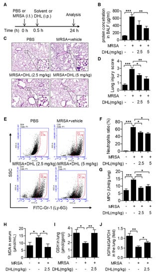 To determine the effects of DHL on Gram-positive bacterial-induced ALI, we established a mouse ALI model by intratracheal injection of MRSA (4 × 107 CFU/mouse). DHL (2.5 and 5 mg/kg) was administered by intraperitoneal injection 0.5 h after MRSA challenge (Figure 4A). The results showed that the BALF protein concentration, an index of lung edema, was prominently increased in MRSA-challenged mice, but decreased in DHL-treated mice (Figure 4B). Histopathological analysis revealed that DHL (2.5 and 5 mg/kg) alleviated the lung lesions in MRSA-injected mice, with decreased inflammatory cell accumulation and alveolar structure destruction (Figure 4C–D). Moreover, infiltration of neutrophils in BAL fluid was determined by staining with anti-Ly6G-FITC (Figure 4E). As shown in Figure 4E–F, DHL administration reduced neutrophil (Ly6G+) infiltration induced by MRSA (2.5 and 5 mg/kg). We also detected MPO activity in this study, since it was considered as a specific marker of neutrophils. The results manifested that DHL inhibited MPO activity (Figure 4G), which confirmed that DHL relieved MRSA-induced neutrophil infiltration. However, these results also displayed that the protective effect of a 5 mg/kg dose of DHL on MRSA-induced ALI was not significantly better than that of a 2.5 mg/kg dose, so we chose a 2.5 mg/kg dose of DHL for subsequent analysis. To further identify the effects of DHL on MRSA-induced ALI, the MDA augmentation, GSH, and tGPX4 reduction, which contribute to lung damage, were also assessed. As displayed in Figure 4H–J, DHL inhibited the augmentation of MDA and reversed the decreases in GSH and tGPX4 induced by MRSA in vivo. Taken together, these results demonstrated that DHL significantly alleviates MRSA-induced ALI.