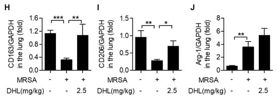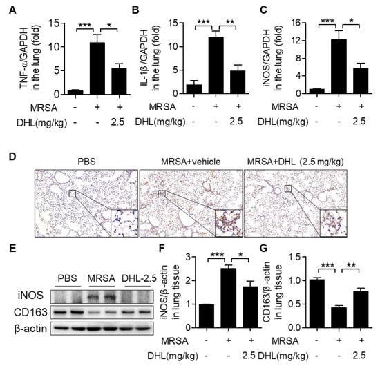 DHL suppresses the MRSA-induced M1/M2 macrophage ratio in mice. Mice were subjected to an intratracheal injection of MRSA (4 × 107 CFU/mouse), and subsequent intraperitoneal injection of vehicle or DHL (2.5 mg/kg) for 24 h. (A–C) The mRNA levels of M1 phenotype marker genes (TNF-α, IL-1β, and iNOS) in lung tissues were measured by real-time PCR. (D) The expression of iNOS in lung tissues was measured by immunohistochemistry (original magnification, 100×). (E) The protein expression of M1 phenotype marker gene iNOS and M2 phenotype marker gene CD163 were detected by Western blot; β-actin was used as the loading control. (F,G) The ratios of iNOS/β-actin (F) and CD163/β-actin (G) were analyzed. (H–J) The mRNA levels of M2 marker genes (CD163, CD206 and Arg-1) in lung tissues. n = 5, * p < 0.05, ** p < 0.01, *** p < 0.001.