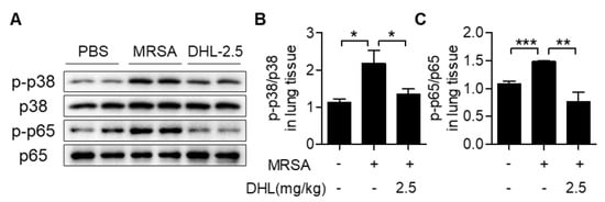 Male C57BL/6 mice were randomly divided into four groups: PBS group, MRSA+vehicle group, MRSA+DHL (2.5 mg/kg) group, and MRSA+DHL (5 mg/kg) group [,]. After anesthesia with pentobarbital sodium, mice were intratracheally (i.t.) injected with PBS or MRSA (4 × 107 CFU/mouse) in 50 μL PBS. For MRSA+DHL groups, DHL (2.5 or 5 mg/kg) was intraperitoneally (i.p.) injected 0.5 h after MRSA challenge. All mice were euthanized 24 h after MRSA exposure; serum, bronchoalveolar lavage, and lung tissues were collected immediately for subsequent studies.