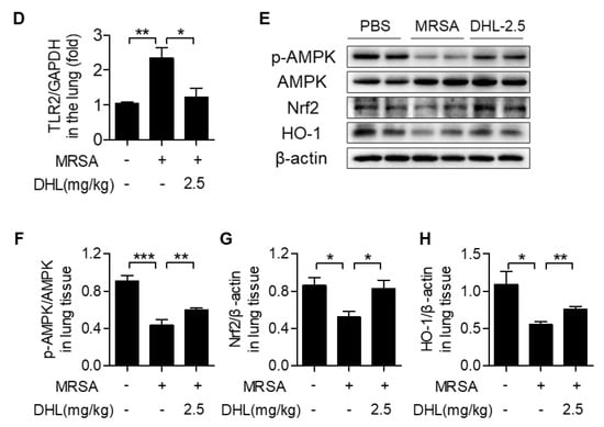 DHL inhibits the TLR2-mediated phosphorylation of p38 MAPK and NF-κB, but promotes the activation of the AMPK/Nrf2 pathway in an MRSA-induced ALI model. Mice were subjected to an intratracheal injection of MRSA (4 × 107 CFU/mouse), and subsequent intraperitoneal injection of vehicle or DHL (2.5 mg/kg) for 24 h. The lung tissues were collected for further analysis. (A) The phosphorylation of p38 MAPK and p65 of mouse lung tissues was measured by Western blot; the ratios of p-p38/p38 (B) and p-p65/p65 (C) were semiquantitatively analyzed using ImageJ software. (D) The mRNA level of TLR2 in mouse lung tissues was tested by real-time PCR. (E) The phosphorylation of AMPK and the total protein contents of Nrf2 and HO-1 in mouse lung tissues were detected by Western blot; β-actin was used as the loading control. The ratios of p-AMPK/AMPK (F), Nrf2/β-actin (G), and HO-1/β-actin (H) were analyzed by ImageJ software. n = 5, * p < 0.05, ** p < 0.01, *** p < 0.001.
