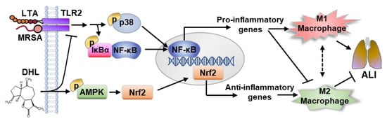 This study was designed to investigate the effects of DHL on Gram-positive bacteria-induced macrophage activation and ALI. As depicted in Figure 7, our results demonstrated that DHL inhibited classical M1 polarization, but promoted the alternative M2 polarization of macrophages to suppress Gram-positive bacteria-induced inflammation in vitro and in vivo. Inhibition of p38 MAPK and NF-κB pathways, as well as activation of the AMPK/Nrf2 pathway, played a crucial role in the effect of DHL on promoting M2 macrophage polarization and restraining M1 macrophage polarization, inflammation, and MRSA-induced ALI.