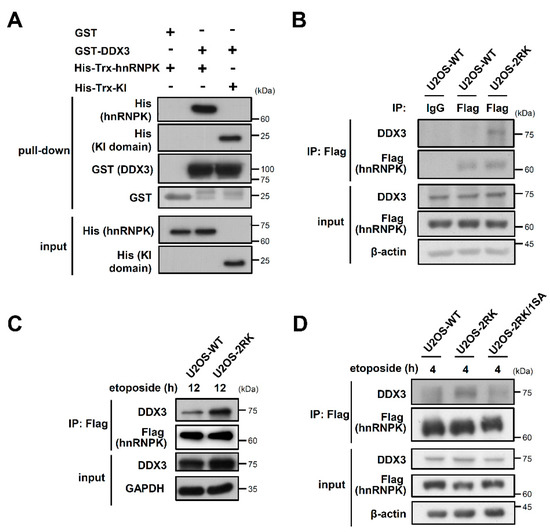 We first showed that DDX3 indeed directly interacts with either full-length hnRNPK or its KI region in vitro (Figure 1A). Previously, the U2OS-WT and U2OS-2RK cell lines were established through the replacement of endogenous hnRNPK with either Flag-tagged wild-type (WT) hnRNPK or hnRNPKMD, respectively, in U2OS cells [15]. Upon DNA damage, the U2OS-2RK cells exhibited higher levels of apoptosis than the U2OS-WT cells (Figure S1). Whether the DDX3–hnRNPK interaction is involved in the apoptosis regulation of U2OS-WT and U2OS-2RK cells was further investigated. As shown in Figure 1B, hnRNPKMD was able to precipitate more DDX3 than WT hnRNPK, suggesting that DDX3 interacts more strongly with hnRNPKMD than with hnRNPK. In addition, the hnRNPKMD in U2OS-2RK cells exhibited a much higher level of DDX3 interaction under DNA damage conditions than the wild-type hnRNPK in U2OS-WT cells (Figure 1C). Because hnRNPKMD exhibits higher Ser302 phosphorylation, which is essential for DNA damage-induced apoptosis [15], we examined whether the hnRNPK–DDX3 interaction is affected by Ser302 phosphorylation. As shown in Figure 1D, the loss of Ser302 phosphorylation in hnRNPKMD (R296K/R299K, S302A) significantly reduced the DDX3–hnRNPKMD interaction under DNA damage conditions. These results suggest that DDX3 preferentially binds to hnRNPKMD in the presence of Ser302 phosphorylation and under DNA damage conditions.