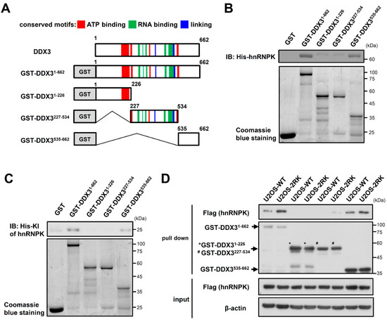 The C-terminal region of DDX3 is responsible for hnRNPK–DDX3 interaction. (A) Schematic representation of GST-DDX3 variants established in this study. The red box indicates ATP-binding motifs, the green box indicates RNA-binding motifs, and the blue box indicates the linking area between the ATP and RNA binding sites. Pull-down assays were conducted by incubating each GST-DDX3 variant with either recombinant his-hnRNPK (B) or his-KI (C), followed by SDS-PAGE to determine the interaction between hnRNPK or the KI and DDX3 variants. (D) U2OS-WT or U2OS-2RK cell lysates were incubated with GST-DDX3 variants in pull-down assays to determine whether the methylation of hnRNPK affects its interaction with diverse DDX3 variants. * as GST-DDX1–226, # as GST-DDX3227–534.