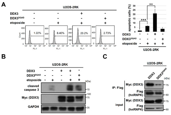 The helicase-inactive DDX3DQAD reduces hnRNPKMD-mediated apoptosis by impairing hnRNPK–DDX3 interaction. (A) U2OS-2RK cells were transfected with either pcDNA4, Myc-DDX3, or Myc-DDX3DQAD for 24 h followed by etoposide (50 μM) treatment for another 12 h. Cell lysates were collected and analyzed by TUNEL assay to determine the degree of apoptosis using FACS (left). Quantitation of apoptotic cells in the TUNEL assay is shown (right). (B) Under the same treatment as described above, cell lysates were collected and analyzed by Western blot to determine the expression levels of cleaved caspase-3, DDX3, and GAPDH. (C) U2OS-2RK cells were, respectively transfected with either Myc-DDX3 or Myc-DDX3DQAD for 36 h followed by immunoprecipitation of hnRNPK-2RK. Subsequent detection of the precipitated Myc-DDX3 or Myc-DDX3DQAD by hnRNPK was performed. ** as p < 0.01, *** as p < 0.001.