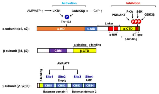 Functional domains of AMPK subunits. AMPKα catalytic subunit (α1 and α2) has an N-terminal kinase domain (α-KD) containing Thr-172 for activation by upstream kinases (LKB1 and CAMKKβ), autoinhibitory domain (α-AID), and two regulatory-subunit interacting motifs (α-RIM), and a C-terminal domain binding to the β-subunit (α-CTD). The ST-loop within α-CTD can be highly phosphorylated by PKB/AKT, PKA, S6K, and GSK3β, which leads to the inactivation of AMPK. The AMPKβ scaffold subunit (β1 and β2) has a carbohydrate-binding module (CBM, a target region for direct AMPK activators, such as A-769662 and salicylate), a C-terminal domain (β-CTD) containing α-subunit binding site, and a domain for γ-subunit interaction. The AMPKγ direct energy-sensing subunit (γ1, γ2, and γ3) has four cystathionine-β-synthase domains (CBS1–4), which form two Bateman domains that create four adenosine nucleotide-binding sites (Site1–4). Site2 always appears to be empty and Site4 has a tightly bound AMP, whereas Site1 and Site3 represent the regulatory sites that bind AMP, ADP, or ATP competitively.