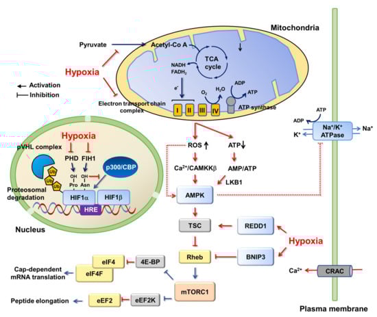 AMPK, mTORC1, and HIF1 in hypoxia. Hypoxia inhibits the mitochondrial electron transport chain complex to impair ATP synthesis. It can cause increases in intracellular ROS level, which increases intracellular Ca2+ to activate AMPK, independent of any AMP/ATP change. When hypoxia lasts hours, intracellular AMP/ATP level is increased, which further enhances or maintains AMPK activation. AMPK inhibits mTORC1 via TSC, which is also directly activated by hypoxia through REDD1. In addition, hypoxia-induced BNIP3 disrupts Rheb-mTORC1 interaction, thereby leading to mTORC1 inhibition. Inactivation of mTORC1 in hypoxia causes the deceleration of protein translation at both initiation (by inhibiting eIF4F mRNA cap-binding complex) and elongation (by activating eEF2 kinase, a negative regulator of elongation factor eEF2) steps. Additionally, hypoxia stabilizes a heterodimeric transcription factor HIF by inhibiting HIFα proline hydroxylase PHD, which prevents the interaction between HIFα and E3 ubiquitin ligase pVHL complex. Molecular pathways regulated by hypoxia are shown in red.