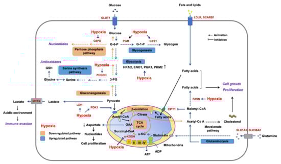 Metabolic adaptation in hypoxia. Hypoxia profoundly influences many key metabolic pathways (Figure 4). Hypoxia decreases pyruvate influx into the TCA cycle in mitochondria by activating lactate dehydrogenase A (LDHA) and pyruvate dehydrogenase kinase 1 (PDK1) in a HIF1-dependent manner [,]. LDHA converts pyruvate to lactate. PDK1 phosphorylates and inhibits pyruvate dehydrogenase (PDH), an enzyme that produces acetyl-CoA from pyruvate to fuel the TCA cycle. The decrease in the metabolic flow into the TCA cycle eventually diminishes cellular aspartate level, which is largely provided by oxaloacetate from the TCA cycle []. Aspartate is necessary for nucleotide synthesis, suggesting that aspartate can be a limiting metabolite for tumor growth []. The hypoxia-induced metabolic reprogramming is one of the key features of tumors. An imbalance between vascular formation/organization and cell proliferation/growth in tumors results in both oxygen and nutrient starvation. It makes cancer cells rewire the metabolic pathways to ensure tumor progression in these unfavorable conditions. First, hypoxic area in tumors develops glucose uptake and the concomitant increase in glycolytic flux. HIF1 reprograms the metabolism by inducing the transcription of genes encoding glucose transporters (GLUT1 and GLUT3), hexokinases (HK1 and HK2), enolase (ENO1), phosphoglycerate kinase (PGK1), pyruvate kinase (PKM2), PDK1, and LDHA [,,,]. This metabolic reprogramming results in the accumulation of lactate and H+ in cytosol, which is secreted by monocarboxylic transporter (MCT4), sodium-hydrogen (Na+/H+) exchanger (NEH1), and carbonic anhydrase (CAR9) []. Extracellular lactate can then be taken up by other cancer cells or stromal cells, where it is used as a fuel for the TCA cycle [,]. Additionally, the lactate can be an alternative carbon source, replenishing the intermediates in the TCA cycle, especially in human non-small-cell lung cancers (NSCLC) []. Notably, the resulting lactate and H+ acidifies the tumor microenvironment to inhibit immune responses around cancers (tumor immune evasion) by suppressing the infiltrating T cells []. Hypoxia also upregulates glutamine uptake by increasing the gene expression of glutamine transporters (SLC1A5 and SLC38A2) [,]. Glutamine is a key anaplerotic substrate for the TCA cycle to fuel TCA intermediates, of which a citrate is converted into cytosolic acetyl-CoA to support lipid biosynthesis in hypoxia. In addition, hypoxia induces E3 ubiquitin-protein ligase SIAH1, which triggers ubiquitination and degradation of α-ketoglutarate dehydrogenase (α-KGDH, an enzyme catalyzing the oxidative conversion of α-ketoglutarate into succinyl-CoA in the TCA cycle). It blocks the flow of glutamine-derived α-ketoglutarate in the TCA cycle and promotes a reductive carboxylation of α-ketoglutarate to citrate for lipogenesis []. Additionally, hypoxia stimulates fatty acid synthase (FASN, a key enzyme in fatty acid synthesis) expression in an HIF1-dependent manner []. Hypoxic metabolic reprogramming also regulates ROS production []. Hypoxia decreases the expression of glucose-6-phosphate dehydrogenase (G6PD), thereby decreasing the flow into the pentose phosphate pathway []. However, at the same time, hypoxia increases phosphoglycerate dehydrogenase (PHGDH) expression to reinforce the serine biosynthesis for antioxidant responses, promoting stress resistance []. Additionally, glucose is redirected into glycogenesis under hypoxia by overexpression of phosphoglucomutase 1 (PGM1) and glycogen synthase 1 (GYS1). Building glucose stores in preparation for glucose deprivation may constitute an auxiliary mechanism [].