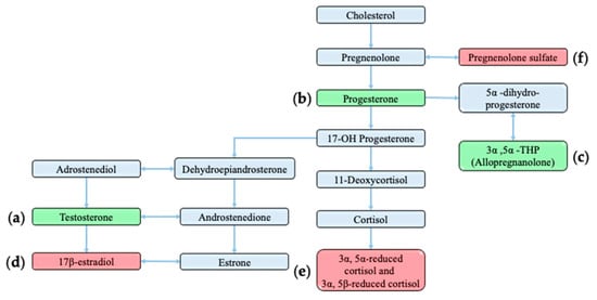Simplified steroid synthesis pathway. Steroids discussed in this review are highlighted as generally having either excitatory (red) or inhibitory (green) effects on GABAA R. For specific references to (a–f) panels, please see the main text. Figure modified from [28].