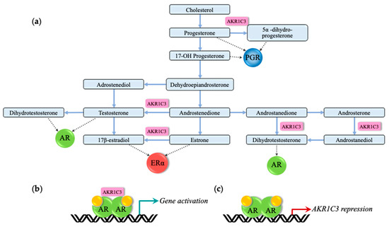 AKR1C3 influence on steroidogenesis and NHR-mediated gene regulation: (a) AKR1C3 influences NHR-mediated gene regulation through converting oestrone into the more potent ERα ligand -oestradiol, progesterone into the weaker PGR ligand 20α-dihydroxyprogesterone, androstenedione into the weaker AR ligand testosterone, and androstanedione into the potent AR ligand DHT. Grey arrows represent the NHR corresponding to each ligand; (b) AKR1C3 regulates AR-mediated gene regulation through acting as a coactivator of AR and production of the AR ligands, testosterone, and DHT; (c) ligand-bound AR represses AKR1C3 gene expression [40].