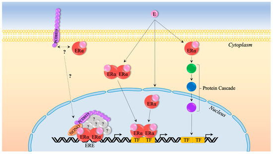 ERα-mediated gene regulation. ERα regulates gene expression through the genomic and nongenomic pathways. Genomic gene regulation involves the binding of oestrogen (E) to cytoplasmic or nuclear localized ERα, resulting in dimerization, a change in receptor confirmation, and, in the case of cytoplasmic ERα, translocation to the nucleus. ERα may recruit corepressors or coactivators (such as PCDH19 and NONO) to regulate gene expression either by directly binding an oestrogen-response element (ERE) or via binding to another transcription factor (TF). The nongenomic pathway involves membrane-bound ERα, rapidly and indirectly influencing gene expression through the cascade activation of DNA binding proteins [35].