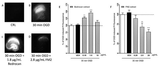 Qualitative and quantitative analysis of the effects of Bedrocan and FM2 extracts on OGD toxicity in rat organotypic hippocampal slices. OGD was applied for 30 min, and 24 h later, the damage in the CA1 region was assessed, measuring the intensity of PI fluorescence. Drugs were present in the incubation medium during OGD and the subsequent 24 h recovery period. (A) Hippocampal slice under normal conditions (background PI fluorescence), slice exposed to 30 min OGD displaying intense PI labeling in the CA1 subregion (B), CA1 damage induced by 30 min OGD was exacerbated by the presence of 1.8 g/mL of Bedrocan extract (C) CA1 damage induced by 30 min OGD was attenuated by the presence of 2.8 g/mL of FM2 extract (D). (E) The Bedrocan extract at the doses of 0.18 and 1.8 mg/mL significantly exacerbated CA1 injury in comparison to the damage caused by 30 min OGD alone, considered as 100%. (F) The FM2 extract dose-dependently attenuated CA1 injury. Data are expressed as percentage of OGD-induced PI fluorescence. Bars represent the mean ± SEM of at least 5 experiments run in quadruplicate. (** p < 0.01 and *** p < 0.001 vs. OGD; one-way ANOVA plus Dunnett’s test).