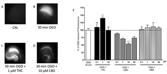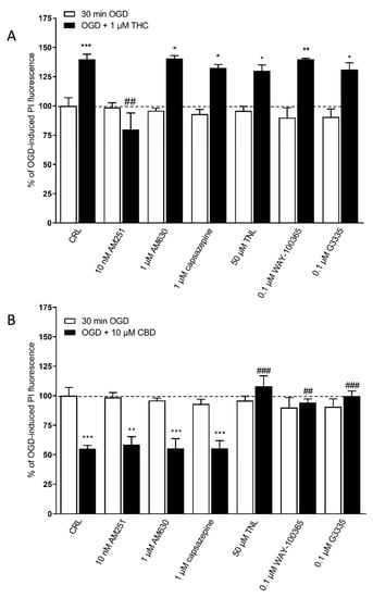 Organotypic hippocampal slice cultures were prepared as previously reported []. Briefly, hippocampi were removed from the brains of male and female 7–9-days-old Wistar rats (Charles River, MI, Italy), and transverse slices (420 μm) were prepared using a McIlwain tissue chopper and transferred onto semiporous membranes inserts and maintained in culture for 14 days in vitro. The slices were subjected to OGD by exposure to a serum-free medium devoid of glucose and previously saturated with 95% N2/5% CO2. Following 30 min incubation at 37 °C in the airtight anoxic chamber, the cultures were transferred to an oxygenated serum-free medium containing 5 mg/mL glucose and returned to the incubator under normoxic conditions until the neuronal injury was evaluated 24 h later [,]. The drugs were incubated during the 30 min of OGD and the subsequent 24 h recovery period. Cell injury was assessed in organotypic hippocampal cultures using propidium iodide (PI), a polar dye that enters the cells only if the membrane is damaged and becomes fluorescent upon binding to DNA. PI was added to the medium at the end of the 24 h. Thirty minutes later, fluorescence was viewed using an inverted fluorescence microscope (Olympus IX-50; Solent Scientific, Segensworth, UK) equipped with a xenon-arc lamp, a low-power objective (4X), and a rhodamine filter. Images were digitized using a video image obtained by a CCD camera (Diagnostic Instruments Inc., Sterling Heights, MI, USA) controlled by software (InCyt Im1TM; Intracellular Imaging Inc., Cincinnati, OH, USA) and subsequently analyzed using the Image-Pro Plus morphometric analysis software (Media Cybernetics, Silver Spring, MD, USA). In order to quantify cell death, the CA1 hippocampal subfields were identified for OGD toxicity was identified and encompassed in a frame using the drawing function in the image software (ImageJ; NIH, Bethesda, Rockville, MD, USA), and the optical density of PI fluorescence was detected. THC was dissolved in methanol and stored at −20 °C. WAY-100635 was dissolved in water. CBD, CBG, AM251, AM630, TNL, and G3335 were dissolved in dimethyl sulfoxide (DMSO) and stored at −20 °C. Prior to the application of the drugs to hippocampal slices cultures, they were diluted in cell culture medium. Each drug was added to slices with a maximal final solvent concentration of 0.1% (v/v) DMSO or 0.3% (v/v) methanol in cell culture medium. Control experiments with equimolar concentrations of DMSO or ethanol alone did not show any significant effects on the parameters investigated in this study (data not shown).
